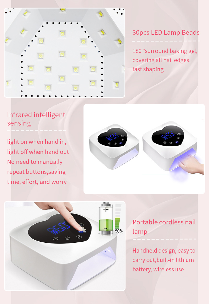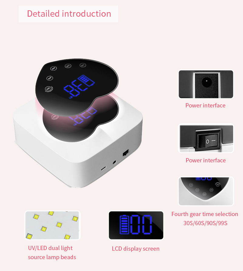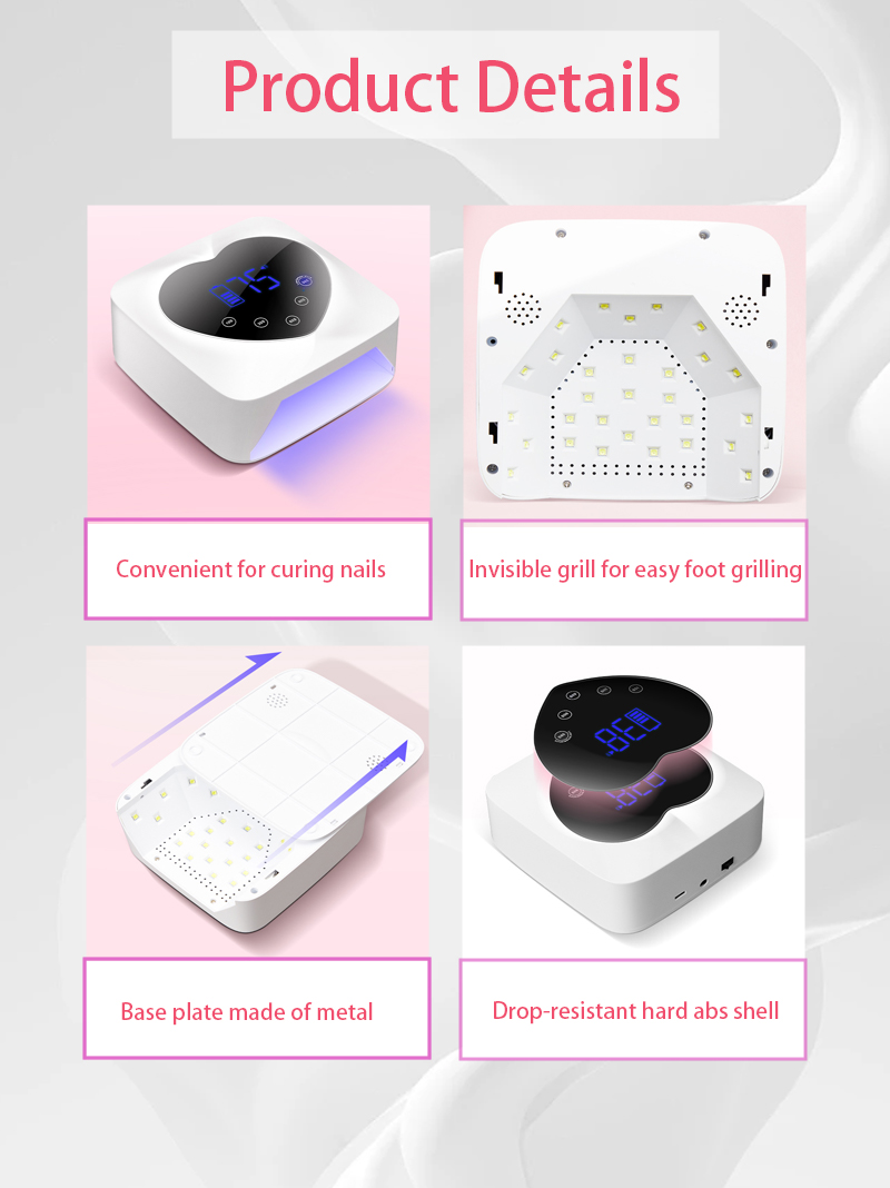 Produktet sikrer en jævn limtørring uden krympning. Dens dobbelte lyskilder giver skånsom opvarmning for at forhindre misfarvning af hænder og anstrengte øjne, velegnet til både hænder og fødder, hvilket giver bemærkelsesværdigt hurtigttørrende resultater.