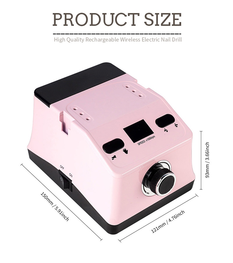 Displaydesignet på denne håndholdte negleboremaskine og polermaskine har en tænd/sluk-knap og frem/tilbage-drejning for i alt én-knaps aktivering, en hurtigopladningssokkel i bunden, en udskiftelig boresok i toppen og en tre-positions justerbar hastighed for at imødekomme en række forskellige behov.