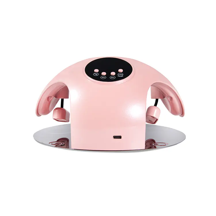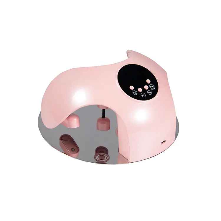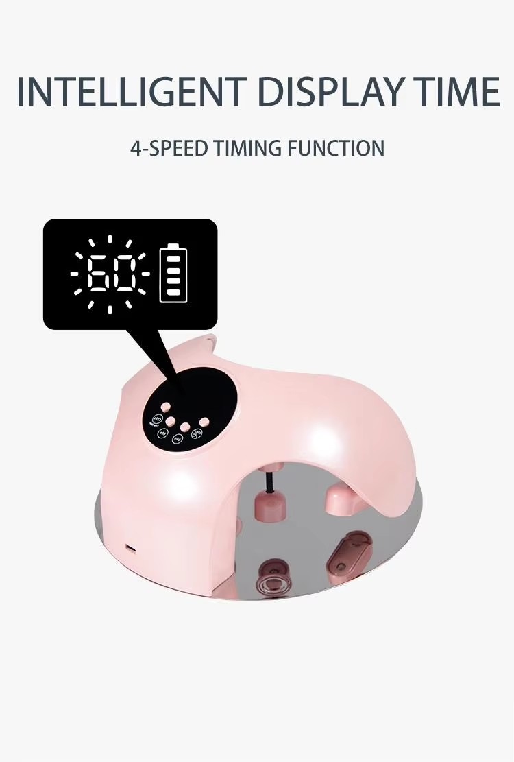 1)Overfladedisdesignet af den genopladelige negle tørretumbler lampesnorløs med hjerteform 72W har en stor hjerteformet intelligent LCD-skærm, med 10s/30s/60s/90s/99s fem-trins timer kan indstilles med en mekanisk switch-knap, intelligent opbevaring af strøm uden tab.