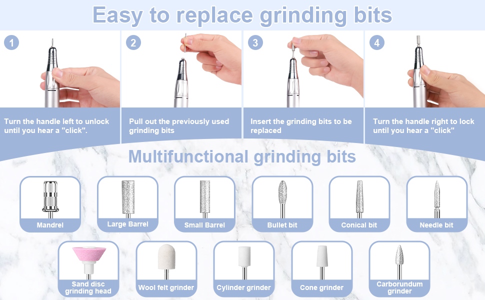 Dette støjsvage bærbare negleboresæt har 2 farver at vælge imellem, sort/hvid/grå/blå/rød/pink/orange, farverige farver.