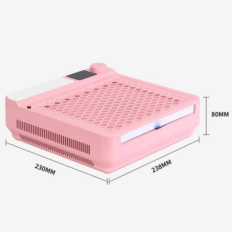 Bunden af produktet har kølehuller til jævn ventilation, og støvsugeren er designet med flere køleventiler i bunden og hele vejen rundt for at sikre jævn ventilation og forlænge levetiden af Multi-funktionel neglepleje støvsugning og fjernelse af alt-i-en maskine.