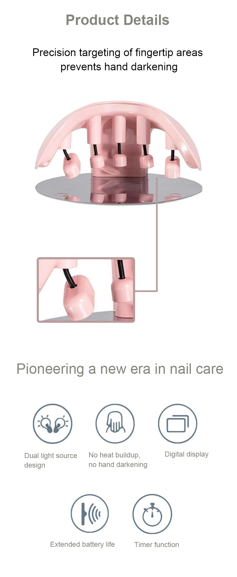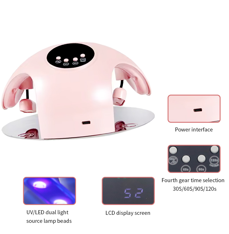 Produktet sikrer en jævn limtørring uden krympning. Dens dobbelte lyskilder giver skånsom opvarmning for at forhindre misfarvning af hænder og anstrengte øjne, velegnet til både hænder og fødder, hvilket giver bemærkelsesværdigt hurtigttørrende resultater.