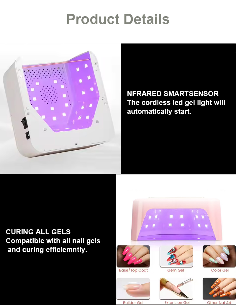 Vores vigtigste produkter omfatter LED-sømlamper: 186W/168W/86W/84W/80W/75W/72W/65W/60W/54W/50W/48W/36W/24W/16W/12W/6W/3W osv. Genopladelige trådløse modeller: 156W/120W/96W/90W/86W/84W/80W/72W/66W/64W/60W/54W/48W osv. Nail art-bor:80W/65W/60W/45W/35W/25W/15W osv. Trådløs opladning modeller: 35,3,3,0 25W, 20W, 15W osv. 25000RPM/30000RPM/35000RPM/40000RPM/45000RPM/Brushless/Ultra-high-speed børsteløs. Fuld støvsamler. 80W/68W/60W/48W/45W/40W/36W/30W/25W/20W/15W/6W osv., Trådløse opladningsmodeller: 80W, 60W, 40W, 30W.