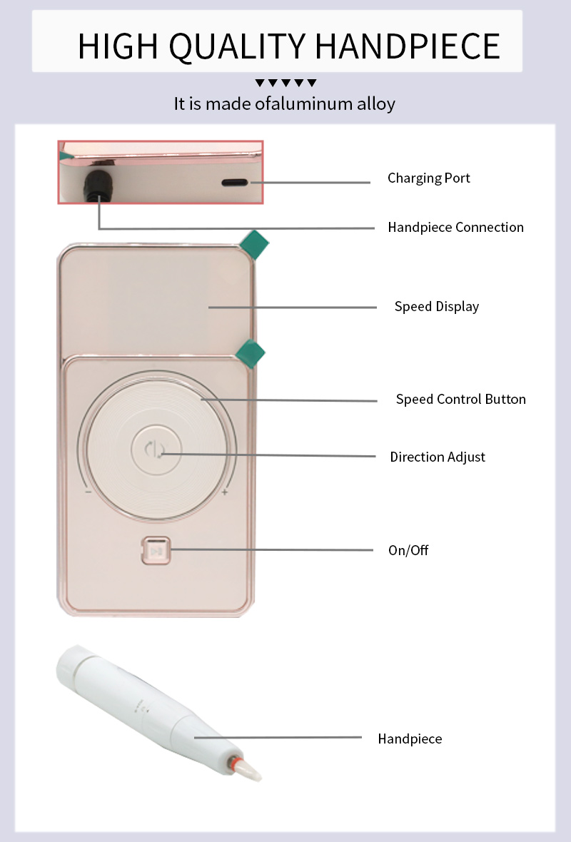 Dette højhastigheds-støjsvage slibepen-displaydesign, med slibepenholder, LCD flydende krystal-display kan vise antallet af omdrejninger/effekt/retning, hastighedsomskifterknap, vippeknap med uret/mod uret, pauseknap, 30.000 rpm professionel motor, indskruningslåsende slibehoved.
