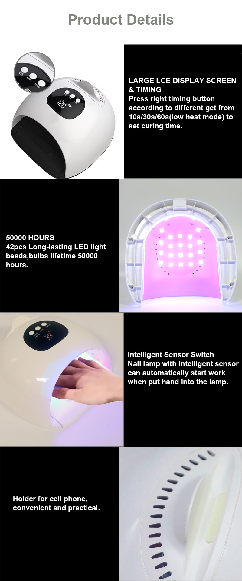 Produktet sikrer en jævn limtørring uden krympning. Dens dobbelte lyskilder giver skånsom opvarmning for at forhindre misfarvning af hænder og anstrengte øjne, velegnet til både hænder og fødder, hvilket giver bemærkelsesværdigt hurtigttørrende resultater.