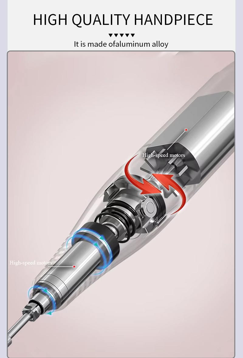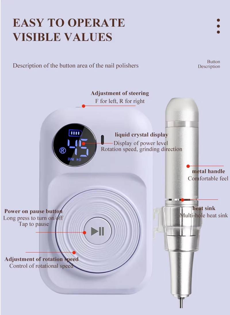Dette førsteklasses støjsvage slibependisplaydesign med slibepenholder, LCD flydende krystaldisplay kan vise antallet af omdrejninger/effekt/retning, hastighedsomskifterknap, vippeknap med uret/mod uret, pauseknap, 30.000 rpm professionel motor, indskruningslåsende slibehoved.