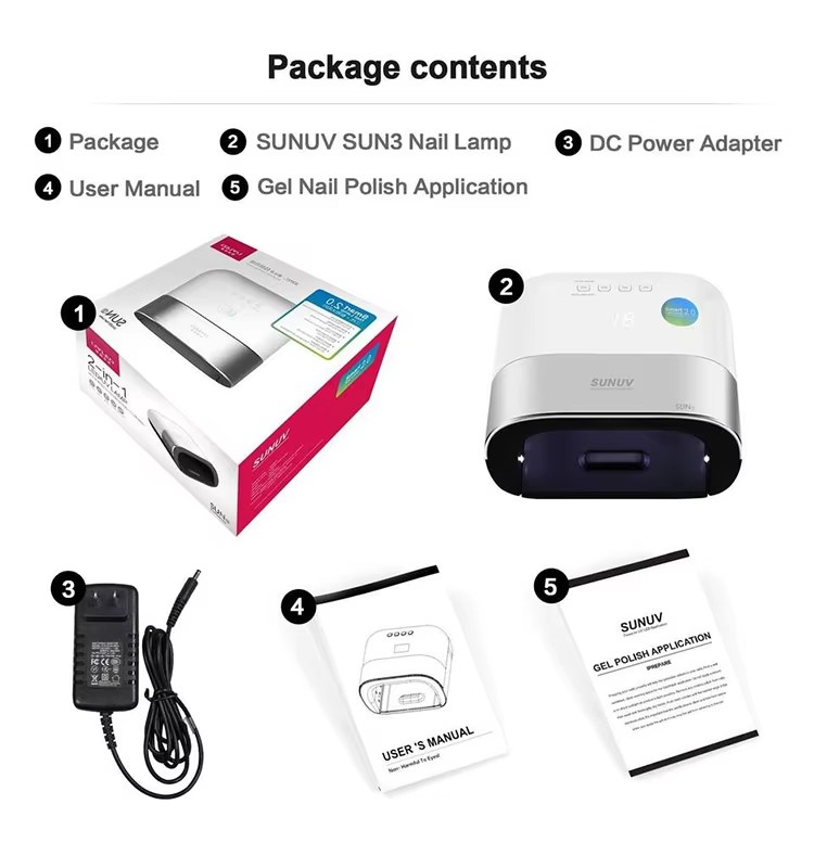 1)Genopladelig neglesalon UV Lystørrer 48W Produktpakke leveres med manuel, opladerstik, opladningskabel, neglelampe.